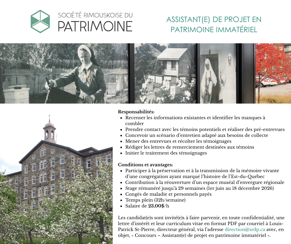Ce stage offre une expérience unique dans le domaine du patrimoine religieux et immatériel, permettant de développer des compétences concrètes en enquête orale et en valorisation patrimoniale. Le ou la stagiaire participera à la préservation et à la transmission de la mémoire vivante d’une congrégation ayant marqué l’histoire de l’Est-du-Québec. Elle contribuera également à une étape importante de la réouverture d’un espace muséal d’envergure régionale.