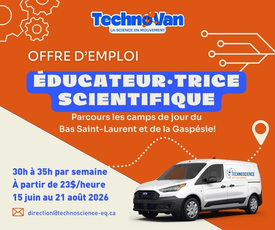 Technoscience Est-du-Québec, un organisme à but non-lucratif voué à la promotion de la science et de la technologie, est à la recherche d’un·e éducateur·rice scientifique pour animer des ateliers scientifiques dans les camps de jour et évènements du Bas-Saint-Laurent et de la Gaspésie pendant l’été 2026.
